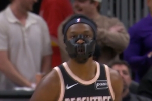 略吓人!硬汉奥孔武牙齿被打掉缺战一场 本场戴着防护面具回归!相关链接:吓到!奥孔武原来是两颗牙被肘掉满嘴是血啊!硬汉!奥孔武被布朗肘到&满嘴是血回更衣室后又回来罚球