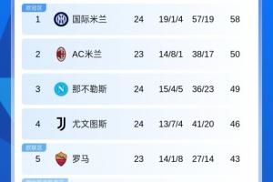 意甲积分榜:国米先赛领先AC米兰8分,尤文第四领先罗马3分体育资讯02月09日讯意甲第24轮,尤文图斯主场2-2战平拉齐奥,近3轮2胜1平。意甲完整积分榜: