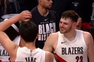 大根人不错!杨瀚森险被比彻姆隔扣 克林根击掌给予鼓励GIF-杨瀚森险被隔扣克林根击掌鼓励小杨